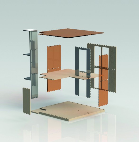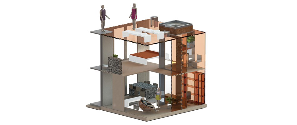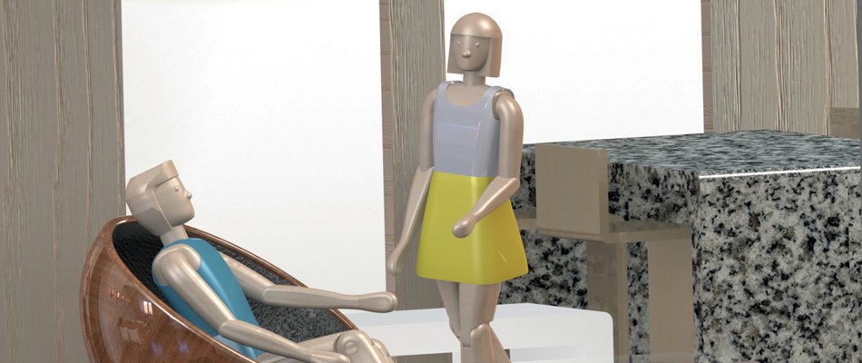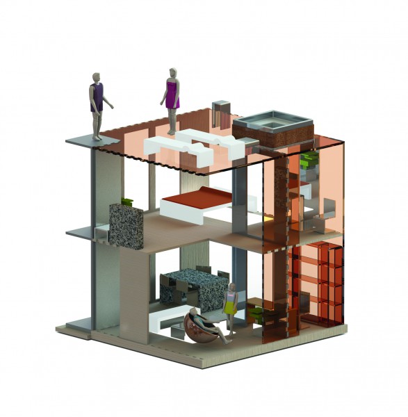 Projekt zabawki dla dzieci w wieku od 6 – 10 lat to domek z wyposażeniem oraz lalki. W zabawce przedstawiono nowy typ podejścia do przestrzeni mieszkalnej, daleki od stereotypów, otwierając przed dziećmi nowy świat oraz kształtując ich wrażliwość i kreatywność. Komplet zabawek zbudowany jest z drewna, szkła akrylowego oraz metalu. Wykorzystane w projekcie materiały odnoszą się do nowych technologii w budownictwie. Domek zbudowany jest z dziesięciu elementów. Siedem z nich jest stałych. Dzięki zestawianiu pozostałych trzech elementów, dzieci mogą wybudować jeden z czterech proponowanych wariantów, znajdujących się w książeczce instruktażowej lub samemu zaproponować inny układ. Daje to możliwość komponowania dowolnego domku, co rozwija kreatywność dzieci oraz kształtuje wyczucie estetyczne. Domek posiada windę, znajdującą się przy głównym wejściu, szklany dach oraz loggie. Zaproponowana konstrukcja daje wrażenie otwartości oraz świetlistości co zachęcać ma do zabawy. Domek wyposażony jest w zestaw modułowych mebelków oraz akcesoriów, które można swobodnie aranżować. Wśród nich są: huśtawka typu łupina, kominek, jacuzzi oraz zestaw mebli łazienkowych wykonanych z HIPS’u pokrytego lustrem. Lalki wykonane są z drewna. Dzięki temu, że ten naturalny materiał posiada indywidualny charakter (usłojenie, barwa) każda z lalek staje się niepowtarzalna. Można je kompletować kupując oddzielnie, wybierając z trzech odcieni drewna. Dzięki temu dzieci uczą się właściwych zachowań społecznych oraz otwartości na świat. W skład zestawu lalek wchodzą: dziewczynka, chłopczyk, mama, tata, babcia oraz dziadek. Dziecko może dowolnie skompletować wymarzoną rodzinę. Projekt domku dla lalek jest odpowiedzią na zalewającą nasz rynek tandetę.